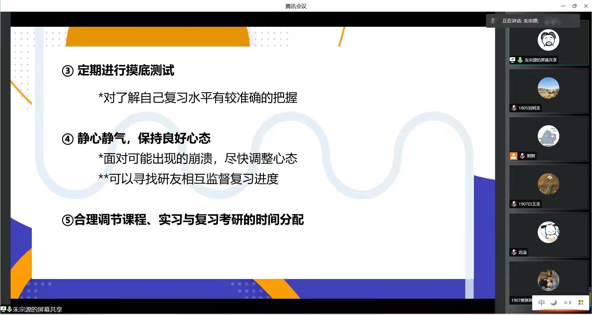 吴世琦、朱澄、朱宗源、郭世豪、刘明龙就自己的考研过程、支教保研经历进行了分享。几位准研究生提醒,在备考中,要合理分配时间,要针对考试科目复习的重点、难点查漏补缺,紧抓基础,不断提高思维能力、学习效率,及时总结;在择校、专硕或学硕选择方面,叮嘱同学们不要盲目从众,要根据报考学校的实际情况来选择;在复习时,英语要注意提高词汇的储备量,政治要关注时事,扎实听课,通过练习来巩固所学内容。