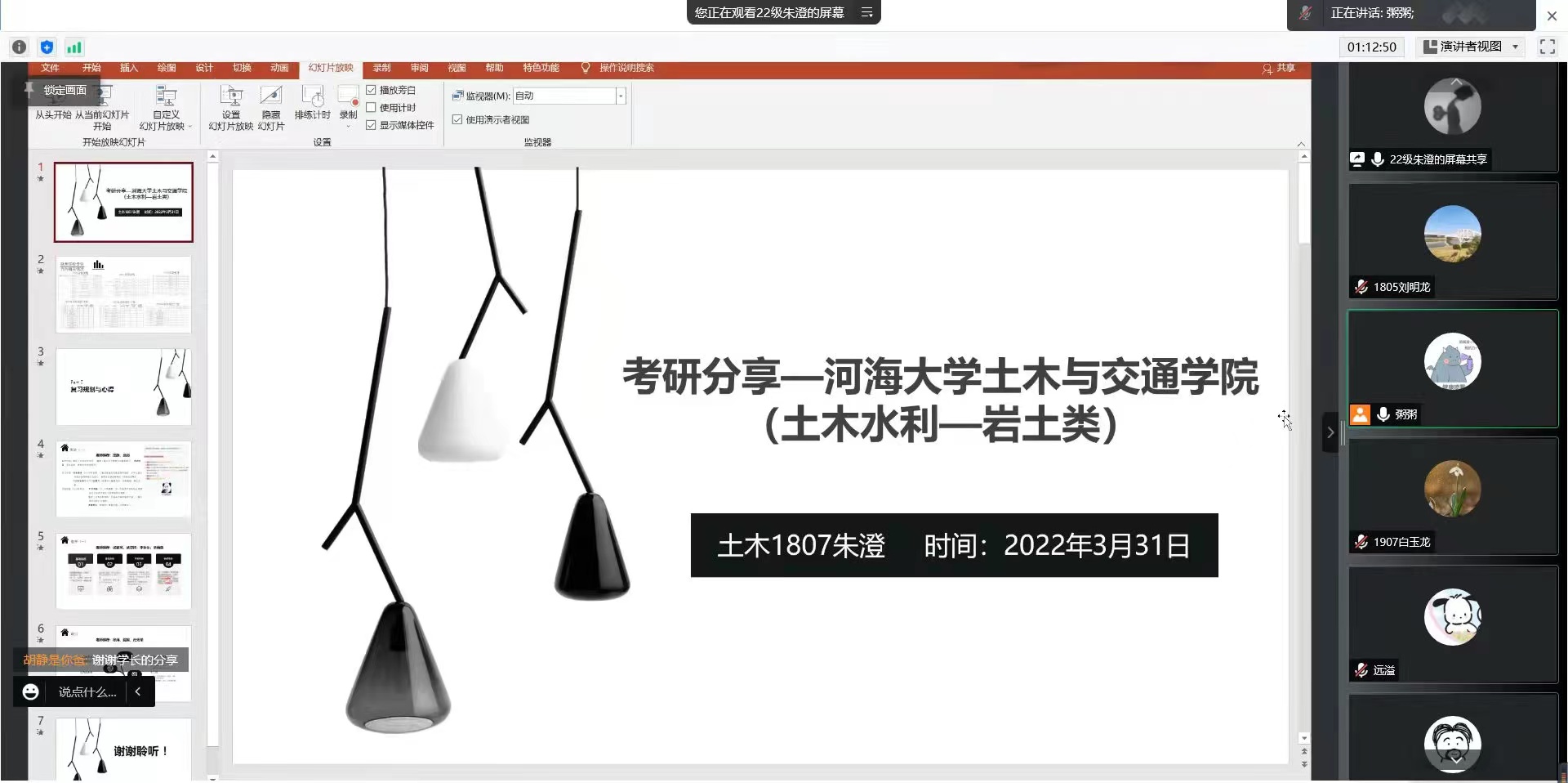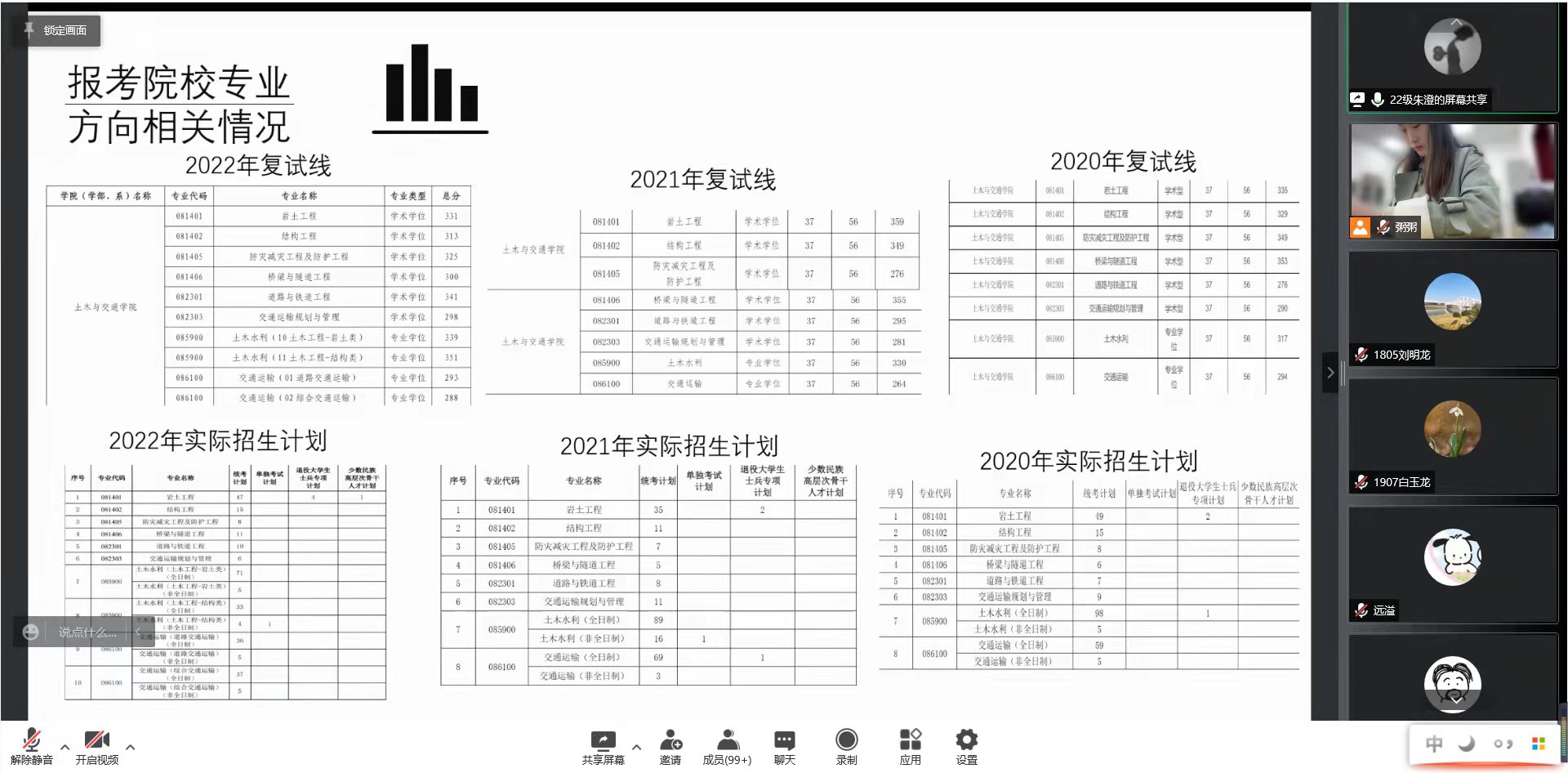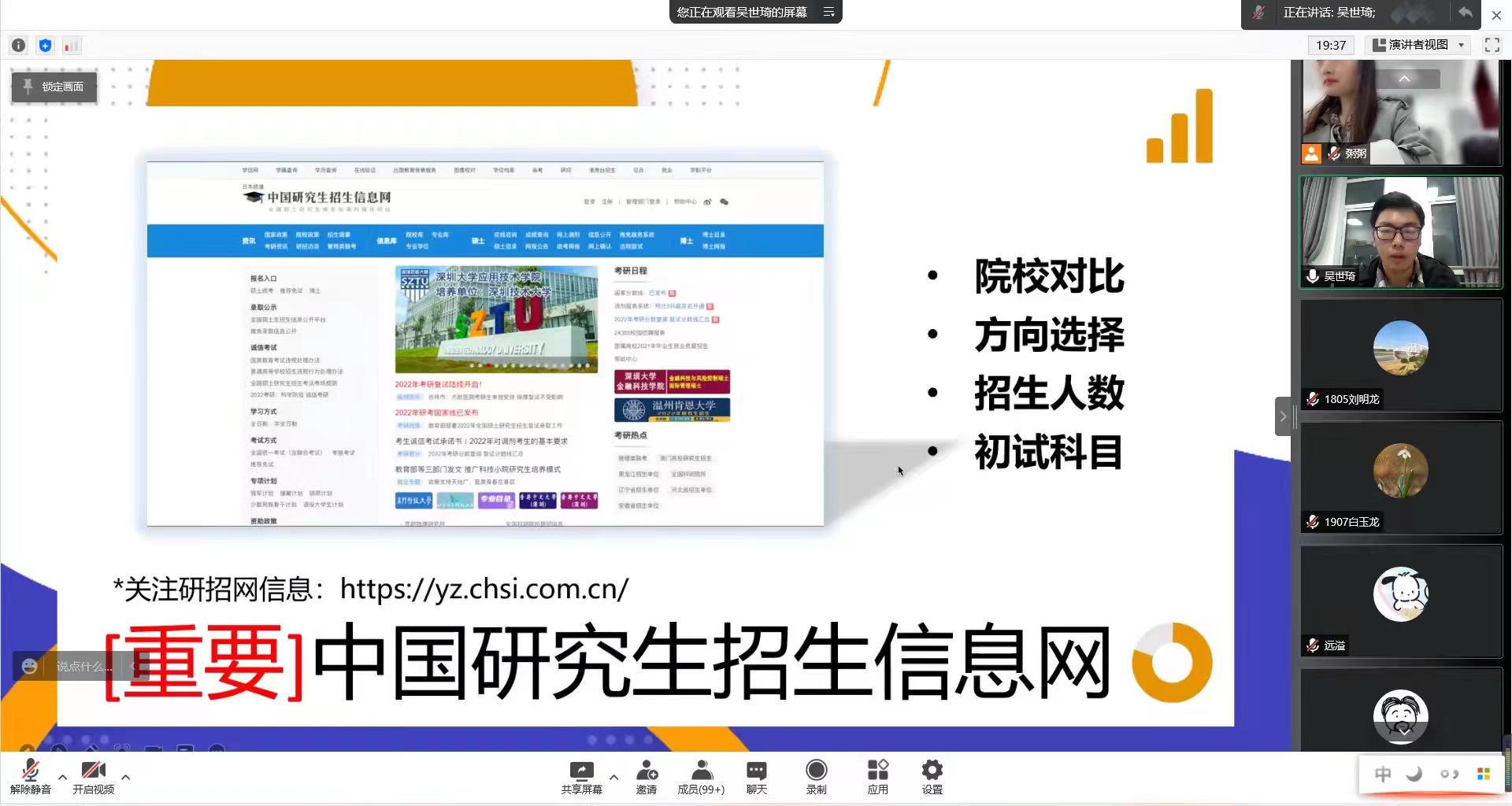为营造优良学风,帮助学生确立考研目标,树立考研信心,了解研究生招考政策与备考技巧,营造浓厚的学术考研氛围,做好“传帮带”,BB贝博艾弗森原官方网站于3月31日召开了19级线上考研经验交流分享会。会议邀请了18级考取西南交通大学、河海大学、中国矿业大学(北京)、大连理工大学、BB贝博艾弗森原官方网站研究生的五位同学作经验交流。会议由辅导员谢雅文老师主持。