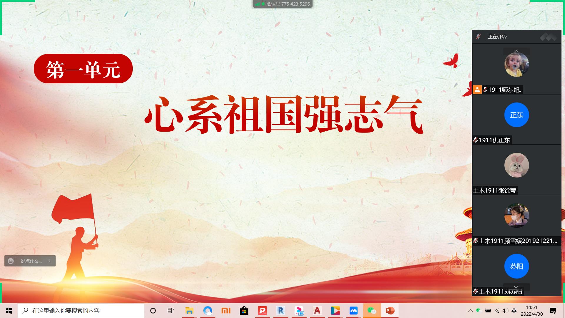 4月30日下午,为加强爱国主义教育,培养同学们的爱党爱国情怀,土木1911班开展“铭记嘱托踏实地,燃情青春向未来”主题班会。本次活动由团支书师东旭主持。
