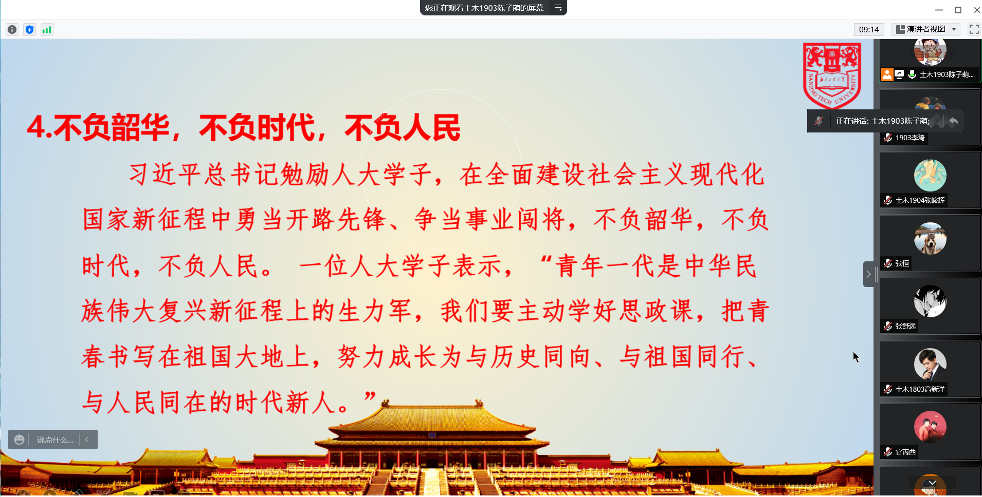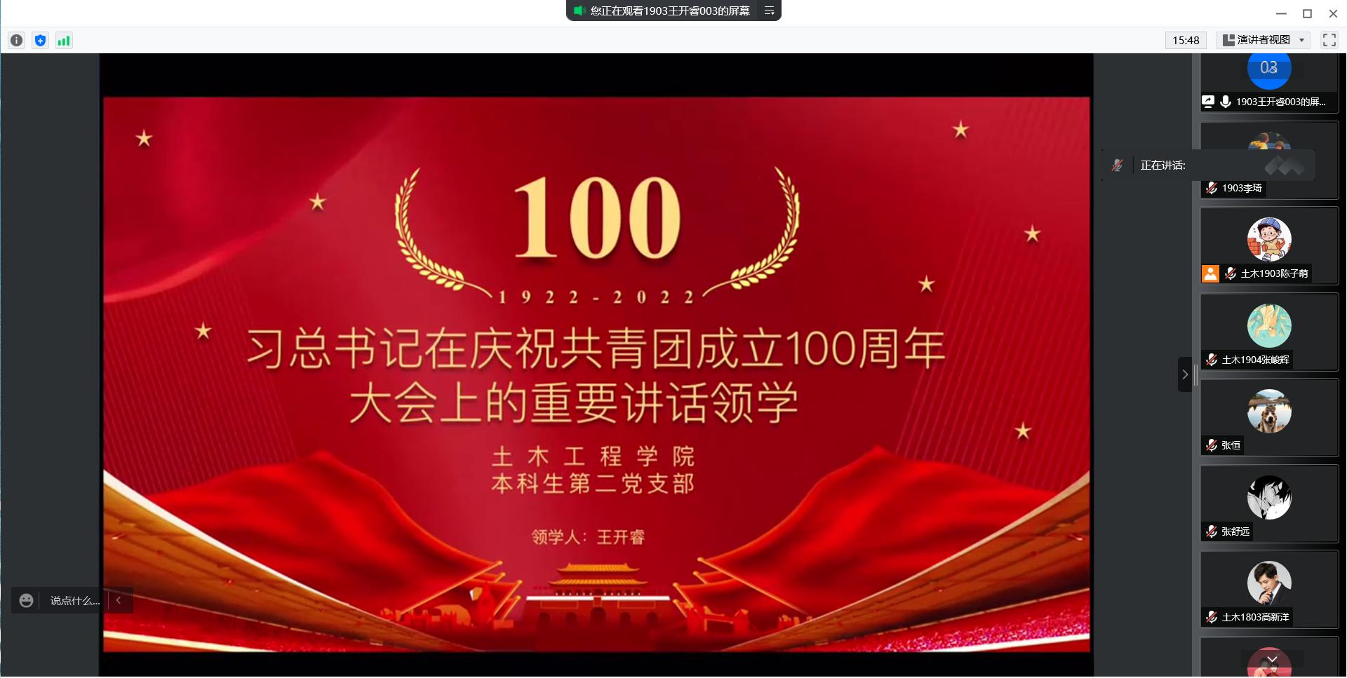 习近平总书记的讲话字字千钧力,句句铿锵响。本科生第二党支部全体党员将携手在新的伟大征程上奋勇前进,不负“复兴栋梁、强国先锋”的铮铮誓言,不负党和人民的殷切期待。